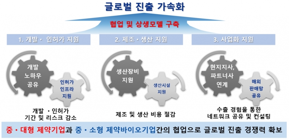 구체적으로는 리딩 기업의 개발, 인허가, 제조생산, 글로벌 인프라 진출 등 노하우와 중소기업의 경쟁력 있는 연구기술을 결합, 역량을 극대화하고 타깃 지역별 임상 지원을 통해 ‘오픈이노베이션을 통한 기술기반 의약품의 글로벌 시장 진출’ 성공 사례를 만들어가기로 했다.