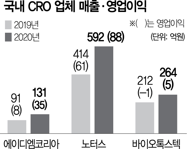 실제 대표 토종 CRO 업체인 에이디엠코리아는 2019년 91억원이던 매출이 2020년 131억원으로 연평균 29% 증가했고 영업이익도 2019년 약 8억원에서 2020년 약 35억원으로 무려 445% 증가했다. 또 다른 업체인 노터스도 지난해 영업이익이 87억5,304만원으로 전년(61억) 대비 30% 증가했다. 같은 기간 매출액은 약 414억 원에서 591억5,828만원으로 28.5% 늘어났다. 바이오톡스텍도 작년 매출액은 264억2,862만원으로 전년(212억 원) 대비 약 2.2% 증가했다. 같은 기간 영업이익은 5억3,746만원으로 전년 (-1억 원) 대비 흑자전환했다.