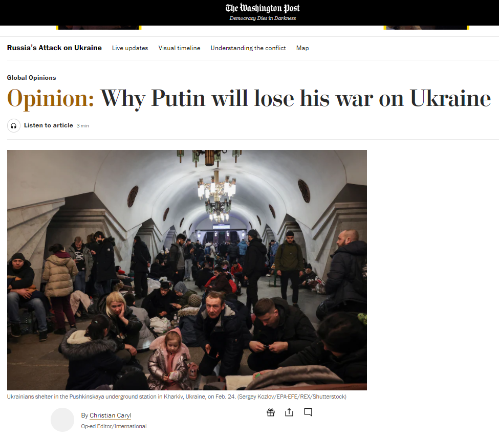 워싱턴포스트의 기명 칼럼 내용을 요약하자면 이렇다. 이런 시민들이 있기에 러시아가 우크라이나를 잠시 점령하는 데는 성공할지 몰라도 결국은 패배할 것이다.