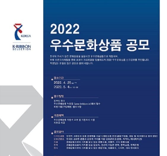 [서울=뉴시스]이수지 기자 = '2022년 우수문화상품' 선정 공모가 25일부터 5월4일까지 진행된다.