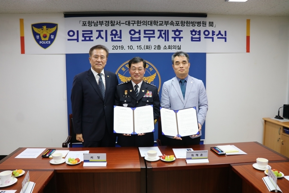 - 포항남부서-포항한방병원, 의료지원 업무제휴 포항남부경찰서는지난 15일 경찰서 2층 소회의실에서 대구대부속 포항한방병원과 업무제휴 협약을 체결했다. 이날 김한섭 포항남부경찰서장, 변준석 대구한의대학교의무부총장, 최해윤 포항한방병원장 등 관계자 13명이 참석했다. 평소 야간 교대근무와 범법자 상대 등 바쁜 일정과 고강도 스트레스에 노출된 경찰관들이 폭넓은 의료 서비스를 받을 수 있도록 계기를 마련해야 할 필요성이 제기돼 왔다. 또한 병원의 안전은 곧 시민들의 소중한 생명과 신체의 안전으로 귀결되는 만큼 시민들이 안전한 의료서비스를 받을 수 있도록 병원은 안전과 평온이 확보돼야 한다는 취지로 업무협약을 체결했다. 이번 협약으로 학교법인 제한학원 산하 의료기관을 포함하는 것으로 의료센터 폭력예방을 위한 비상연락체제 구축 및 신속대처, 경찰서 직원 및 가족 대상 비급여 진료비 및 중풍종합검사 등 의료 혜택을 제공한다는 방침이다.