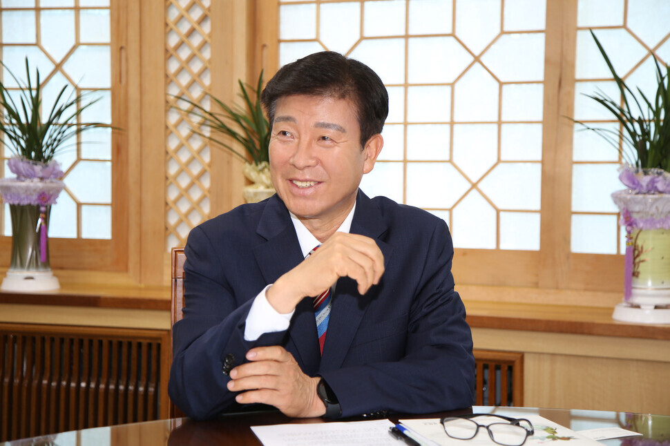 박범인(62) 충남 금산군수는 고향인 금산 남일면 사무소에서 공직을 시작해 충청남도 농정국장을 거친 ‘뼛속까지 금산사람’이다. 민선 7기에 출마했으나 보수 표심이 나뉘어 낙마한 뒤 재도전해 당선했다. 지난달 15일 금산군수실에서 만난 그는 “금산의 근면·도전·진취 유전자를 깨워 인삼의 세계수도로 자리매김하겠다”고 했다.
