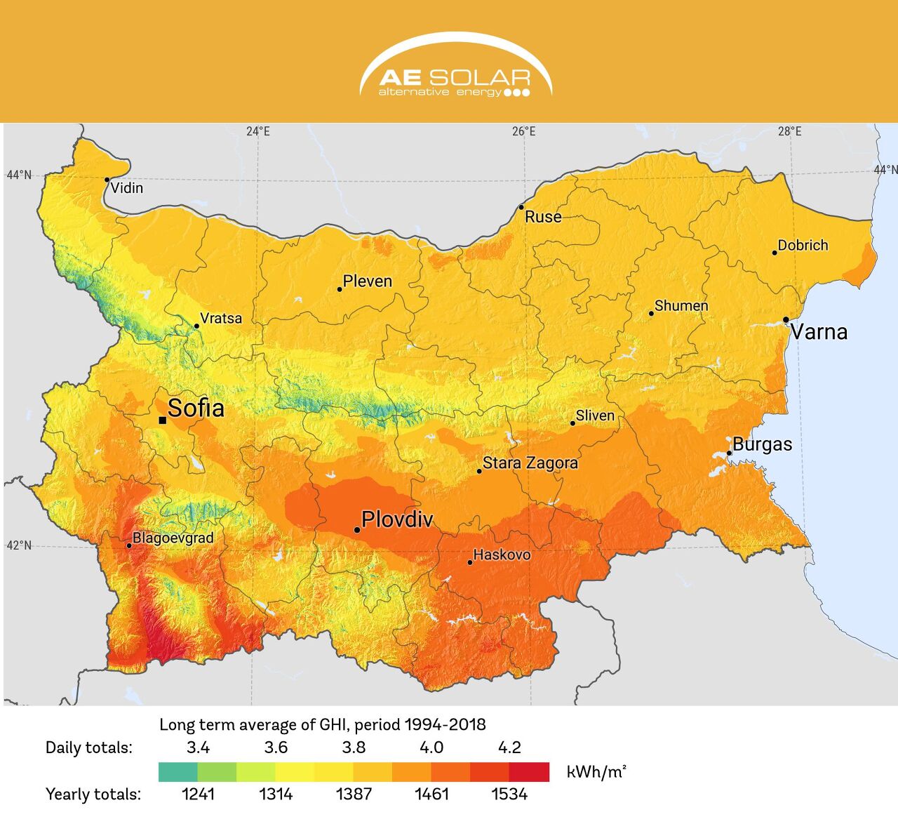불가리아는 특히 남부 지역에서 일사량에 대한 높은 잠재력을 가지고 있습니다. 그림 1에서 국가의 남부 지역이 일반적으로 북부 지역에 비해 더 많은 일사량을 받는 것을 볼 수 있습니다. 이 나라는 2007년에 대부분 수력 발전으로 재생 에너지 확장을 시작했습니다. 태양광 발전 설비는 2009년에 시작되어 2011년에 총 100MW에 도달했지만, 그 이후로 새로운 설치는 2013년에서 2014년 사이에 약 12MW만 설치되어 중단되었으며 용량은 2020년까지 크게 증가하지 않았습니다.