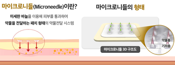 마이크로니들은 머리카락 지름 3분의 1 수준의 미세한 바늘로, 이를 피부에 부착해 약물을 주입할 수 있어 ‘붙이는 주사’로도 일컫는다. 초반에는 일반적인 바늘이 사용됐지만 최근엔 체내에서 녹도록 만들어진 생분해성 바늘도 쓰여지고 있다.