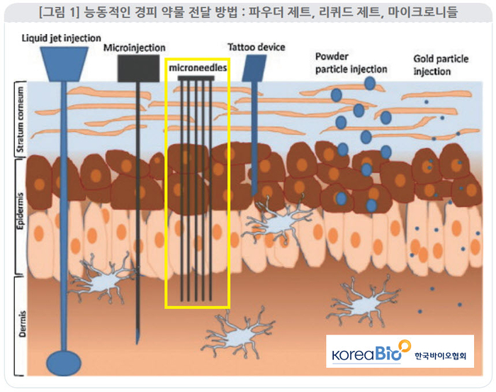 이들을 능동적 경피 약물 전달 시스템이라고 하는데 그파우더 제트, 리퀴드 제트를 포함하여 물리적인 힘을 이용하여 전달하는 방식이다. 그 중 마이크로니들 시스템은 기존 시스템에 비해 제작 단가가 저렴하고 대량 생산이 용이하다는 장점이 있다는 게 한국바이오협회의 해석이다