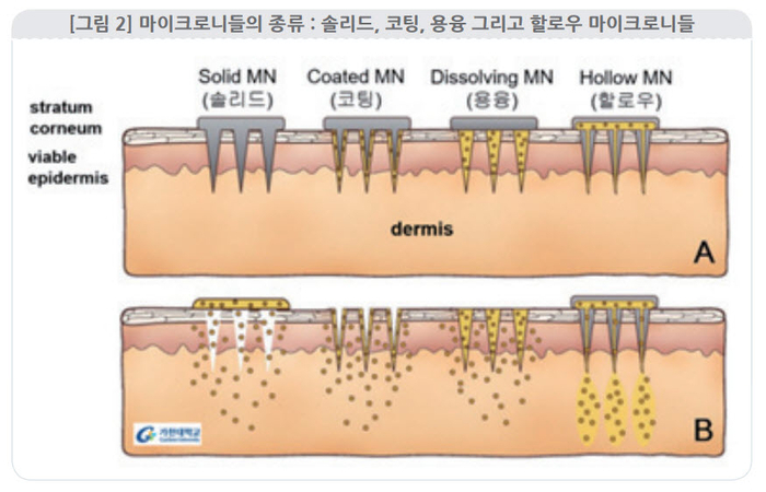 마이크로니들은 크게 네 가지 종류로 구분된다. △솔리드 마이크로니들 △코팅 마이크로니들 △용융 마이크로니들 △할로우 마이크로니들이다. 솔리드 마이크로니들은 기존에 피부과에서 사용되었던 기술로 마이크로니들을 피부 위에 롤링하고 형성된 구멍위에 유효 성분을 도포하는 방식으로 마이크로니들의 초기 형태이다.