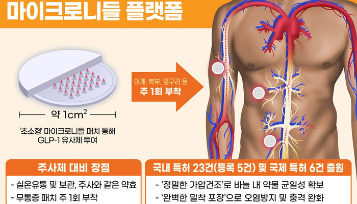 제약바이오업계는 “주사 바늘의 크키가 머리카락의 1/3 수준인 수백 마이크로미터(㎛) 이내여서 환자들의 주사 치료에 대한 공포감과 통증을 줄여 투약 순응도 및 복용 편의성을 높이고, 패치 제형의 특성상 위장관을 거치지 않아 약물 전달율 및 생체 이용률을 향상시킬 수 있다는 장점을 가진다.”고 설명했다.