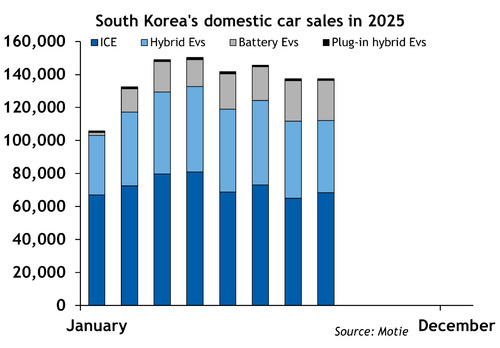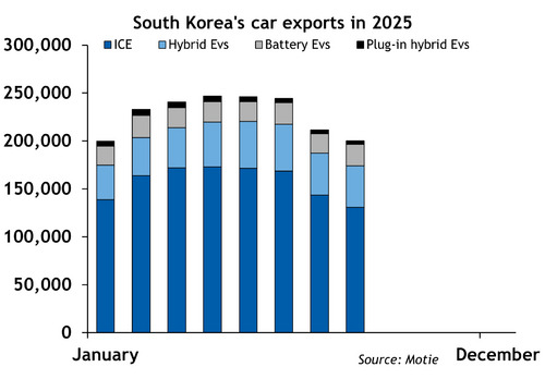 내연기관차(ICE) 수출량은 점차 줄어드는 추세인 반면, 하이브리드 전기차(Hybrid EVs)와 배터리 전기차(Battery EVs), 플러그인 하이브리드 전기차(Plug-in hybrid EVs) 등의 신에너지차 수출이 뚜렷하게 증가하는 모습이 눈에 띕니다. 특히 전체 자동차 수출량이 연중 초반에 약 20만 대에서 25만 대까지 확대되는 가운데, 내연기관차 비중은 점차 하락하며 전기차 비중이 상대적으로 커지는 것이 뚜렷합니다.